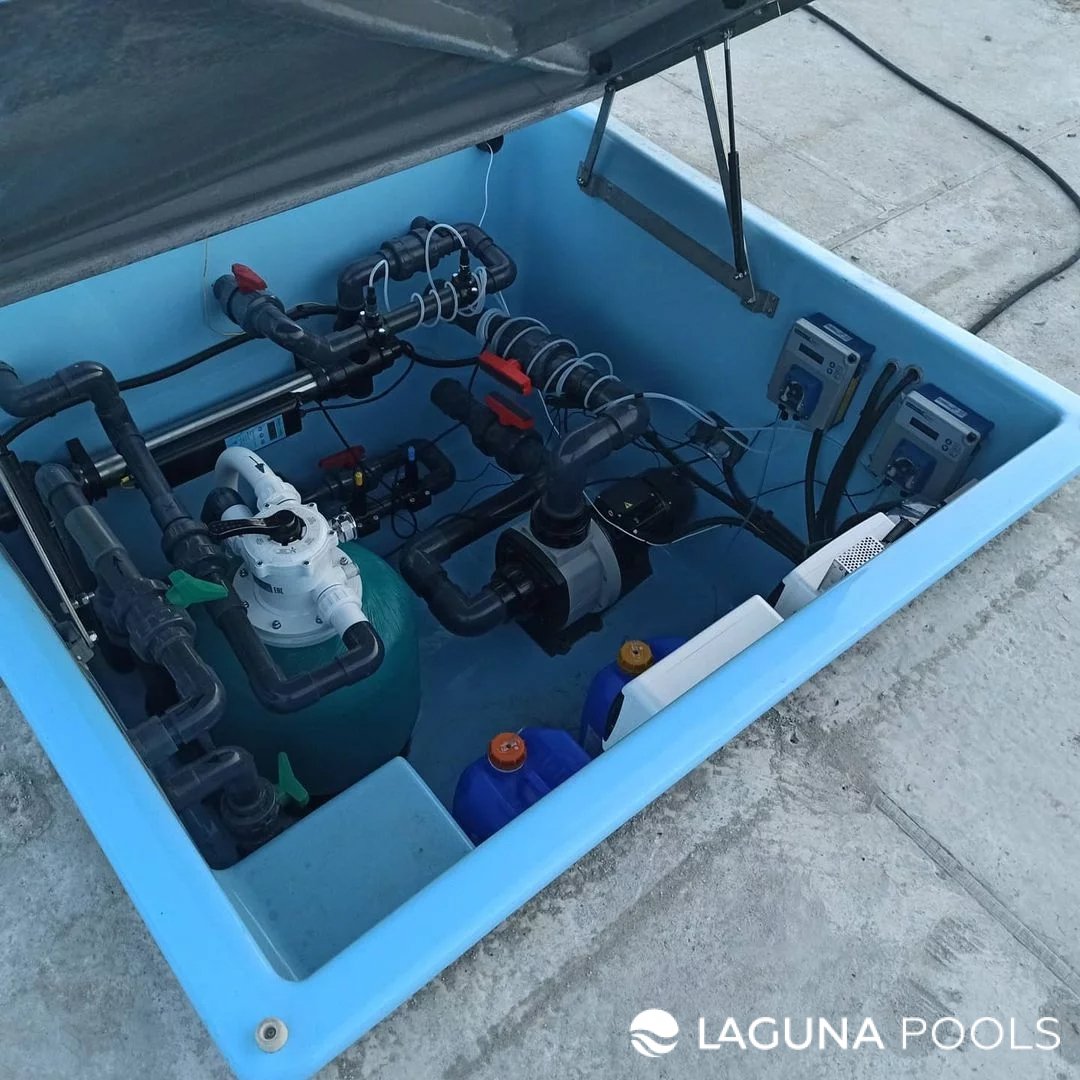 Технический отсек из голубого композитного материала с системой фильтрации и насосами установлен вровень с плиточным покрытием.